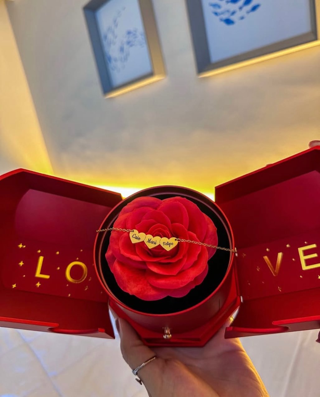 Caixa Rotativa com Rosa Eterna & Colar 2 Corações