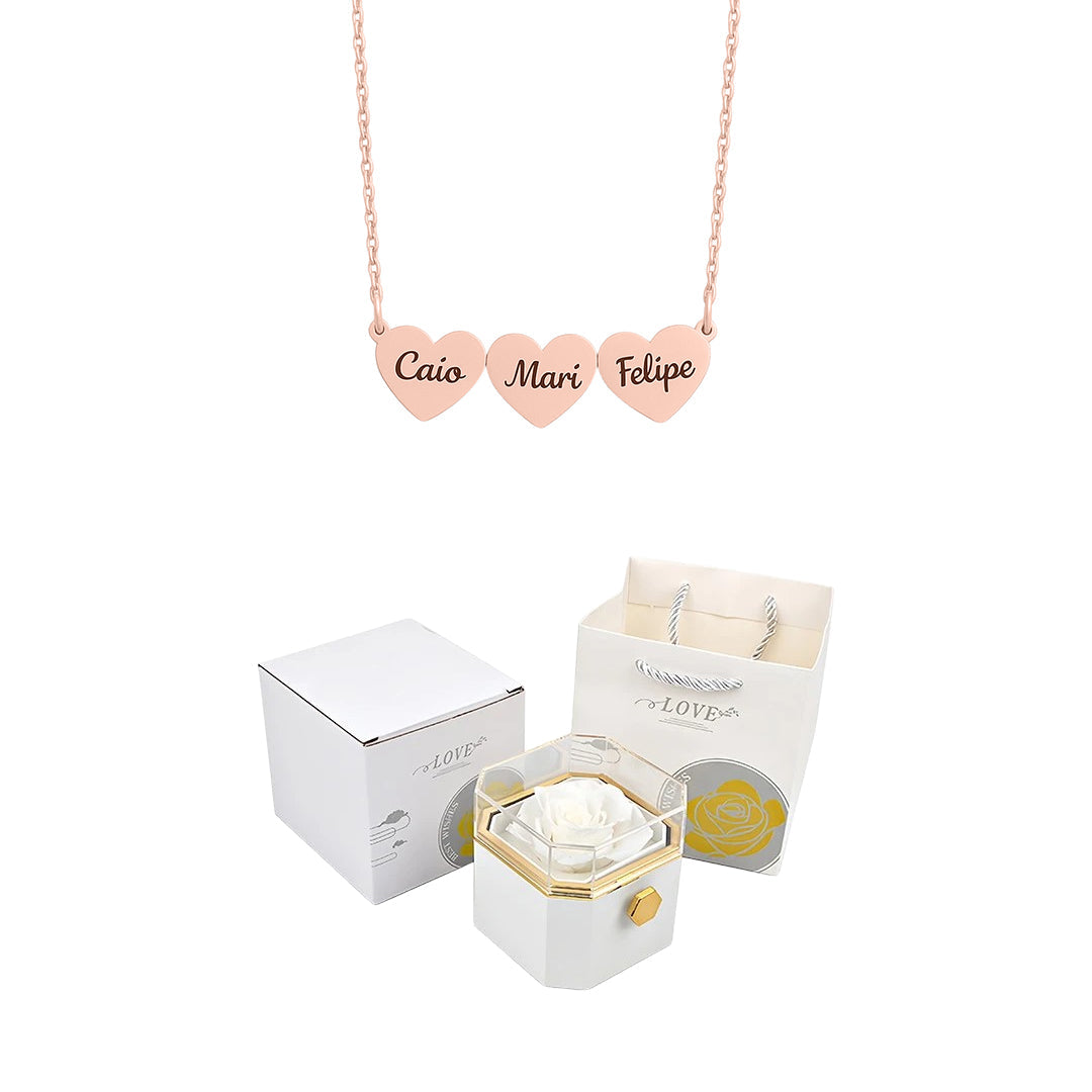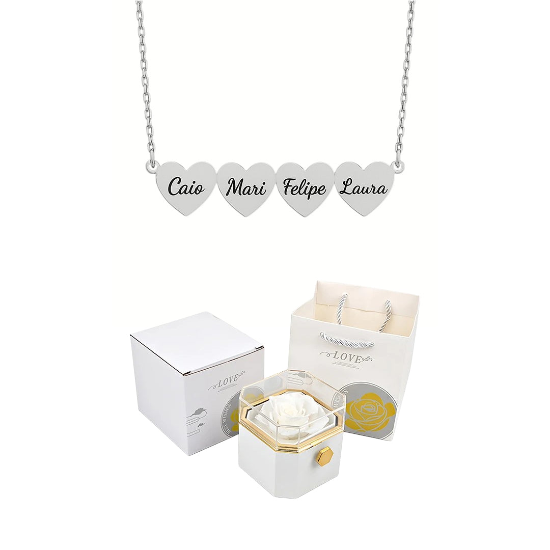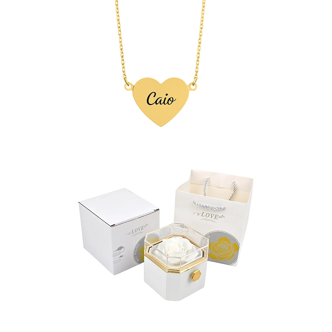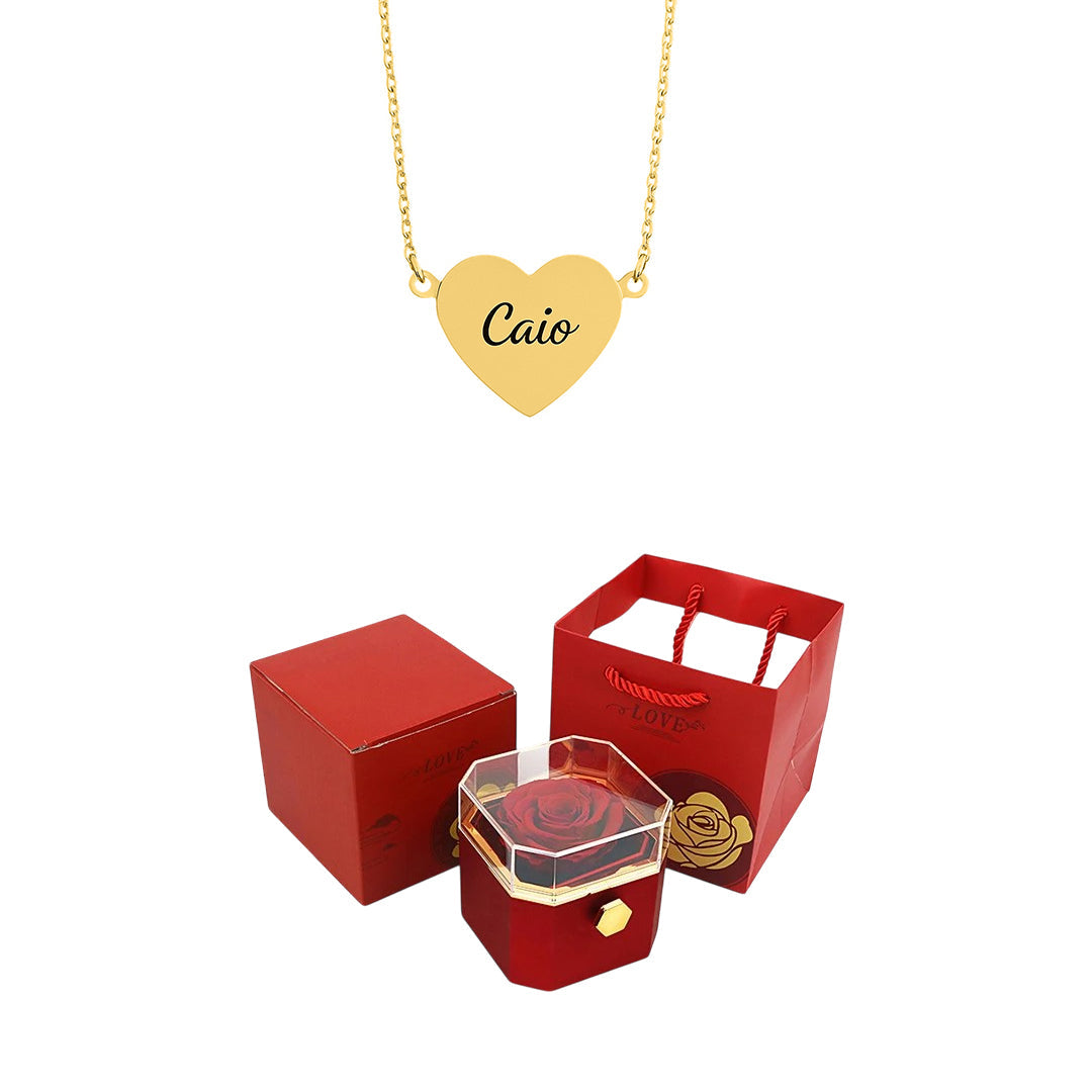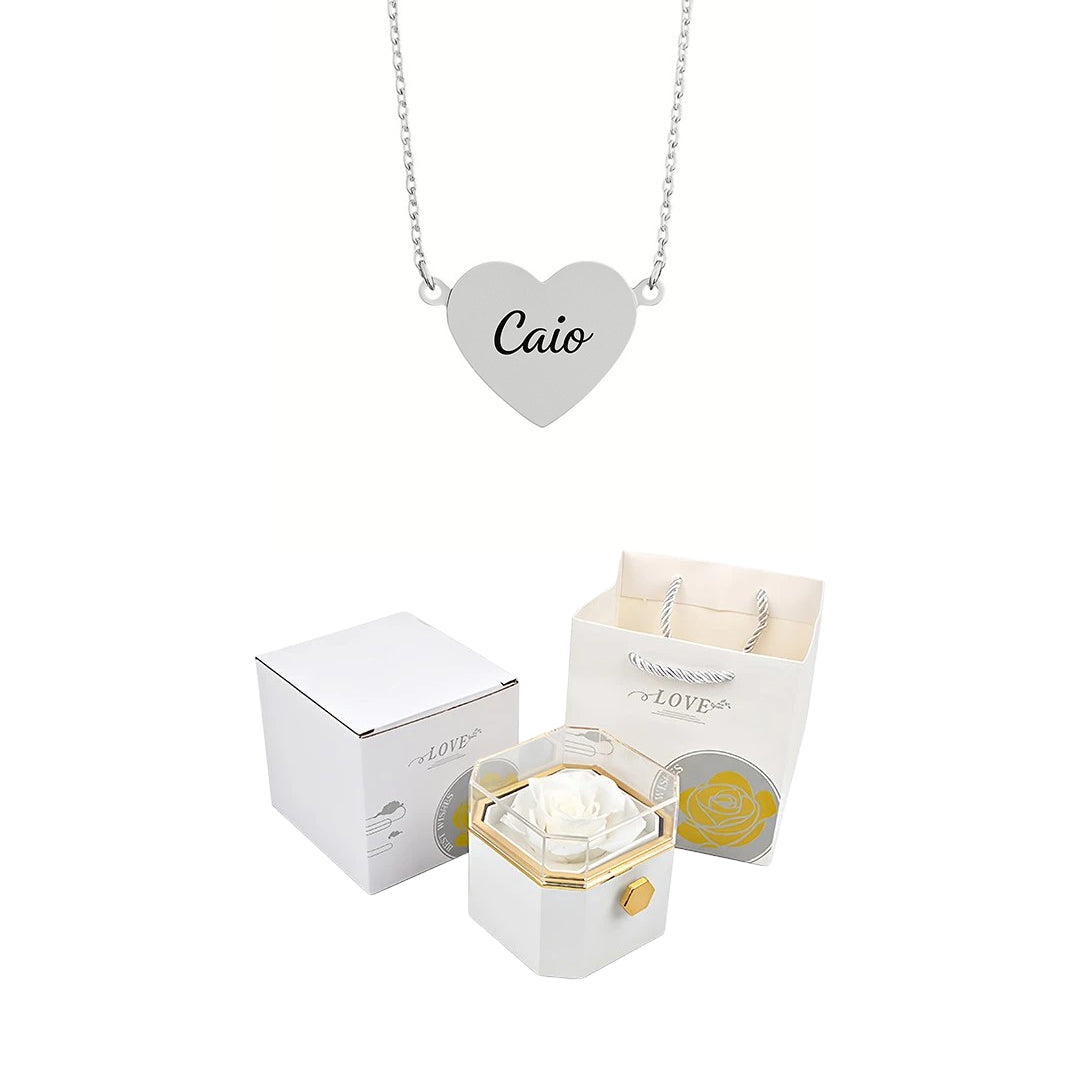 Caixa Rotativa com Rosa Eterna & Colar Coração Gravado com Nomes