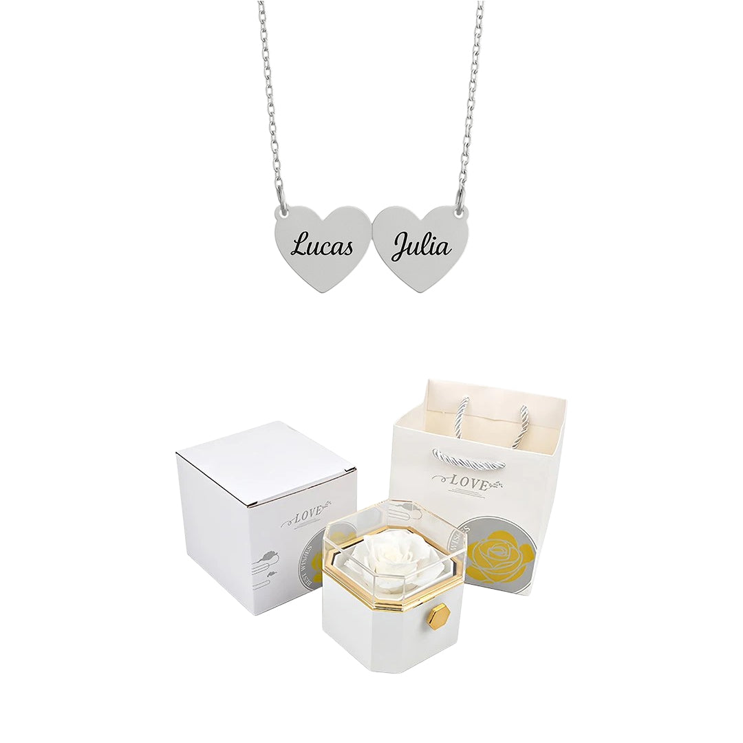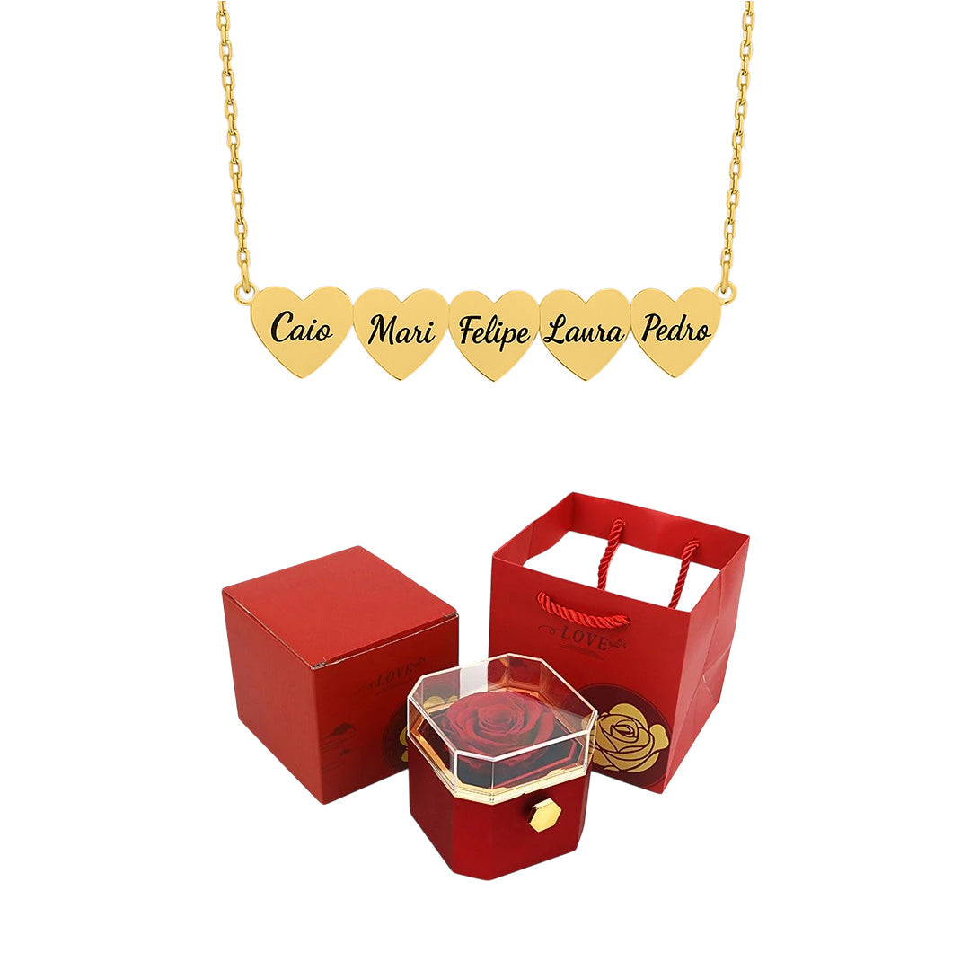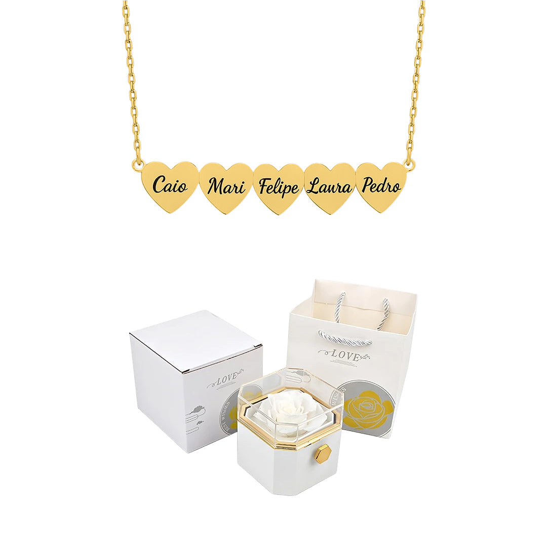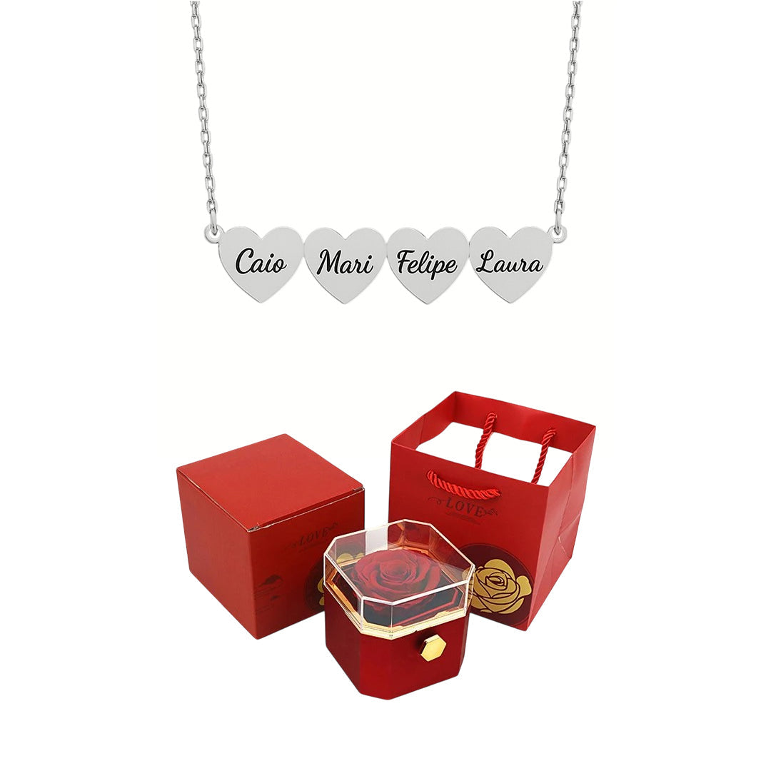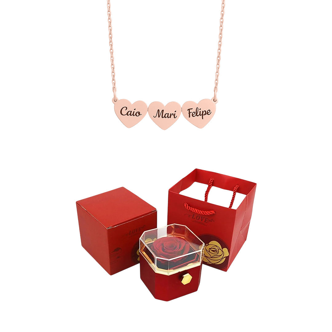 Caixa Rotativa com Rosa Eterna & Colar Coração Gravado com Nomes